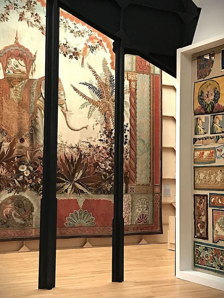 Au rez-de-chaussée de la Cité, on revisite l’histoire de la tapisserie d’Aubusson en traversant « La Nef des tentures » à travers un choix d’œuvres et une scénographie sobre qui fait penser à des décors de théâtre.