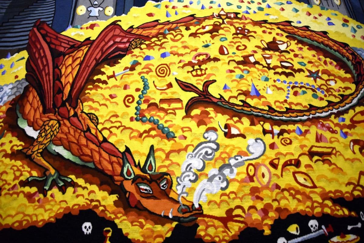 Tolkien est connu pour avoir été le génial créateur du Hobbit et du Seigneur des Anneaux. Le très sérieux professeur de langues anciennes d’Oxford se passionnait pour le monde imaginaire de l’enfance pour lequel il a créé un univers peuplé d’elfes, de nains et de dragons. Les milliers de pages et les nombreux dessins et aquarelles qu’il a réalisés ont inspiré la série de tapisseries et de tapis rassemblés pour la première fois dans cette exposition.